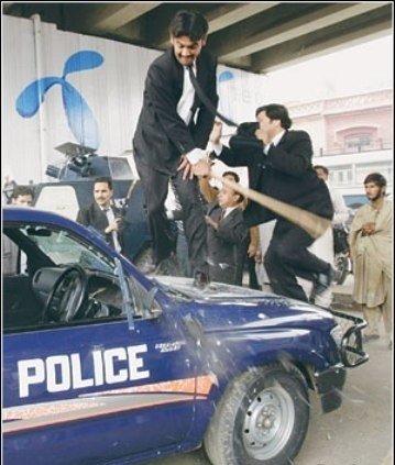 Pakistani Lawyers in 2010, smashing a police car in protest to former President of Lahore Bar Association being accused of raping and murdering a Christian girl named Shazia Bashir of 11 years.