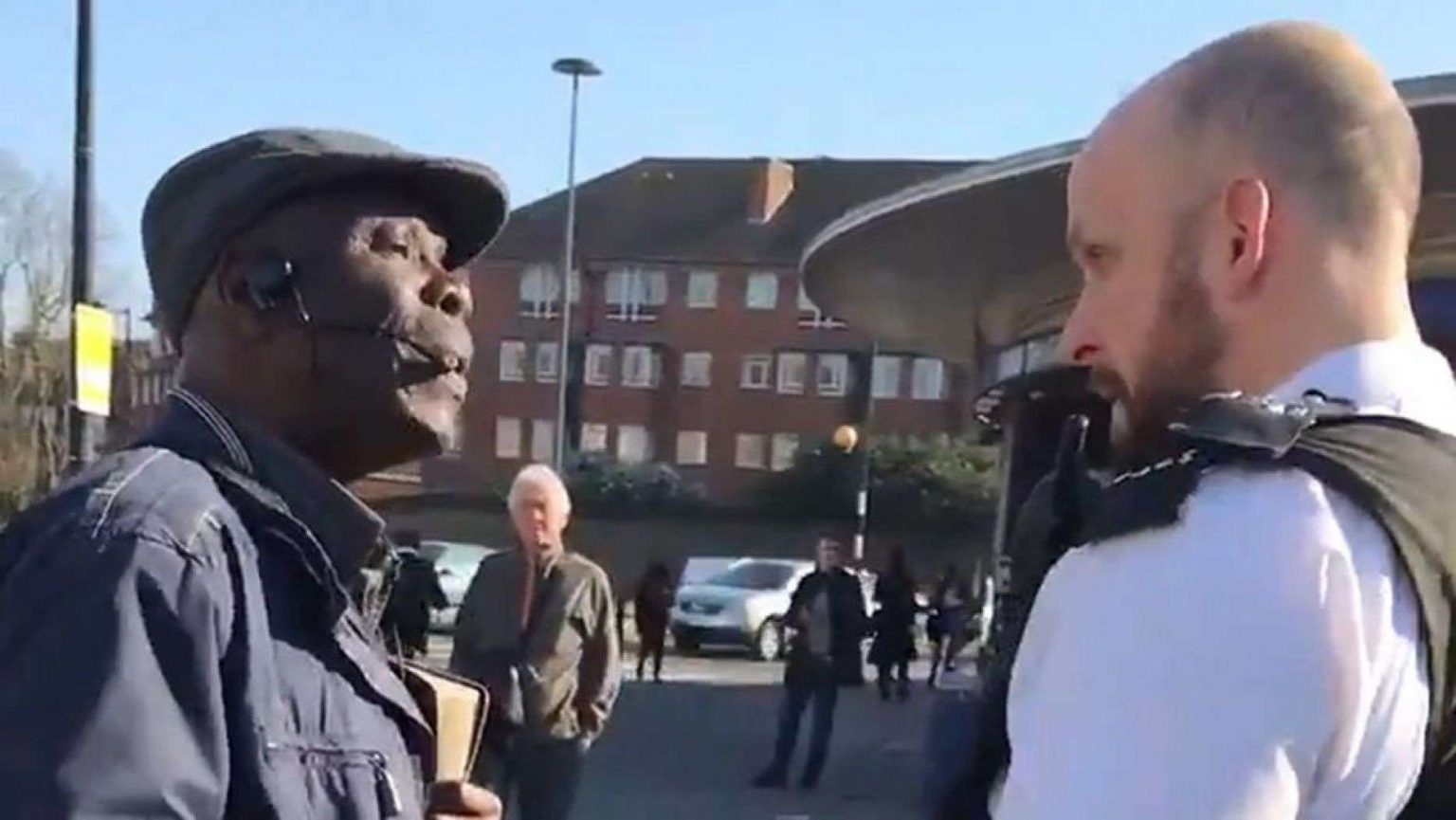 In a verbal exchange recorded in the two-minute video we have acquired from the primary witness who recorded footage, one officer tells the unidentified preacher that he was “required to go away” because he was “disturbing people’s days”.