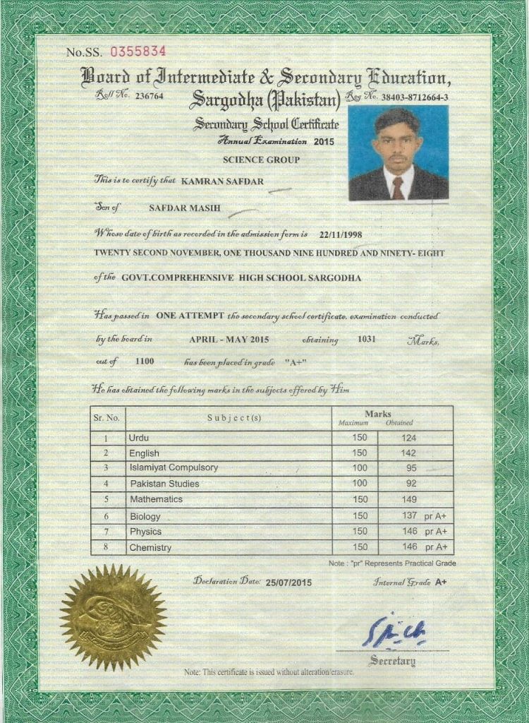 The son of a fruit hawker from Sargodha, District of Punjab in Pakistan, Kamran Safdar’s ambition of becoming a doctor was shattered despite securing the appropriate entrance level of his chosen medical university with an 89% pass in his intermediate high school exam – even though his fellow Muslim students were accepted on lower grades.