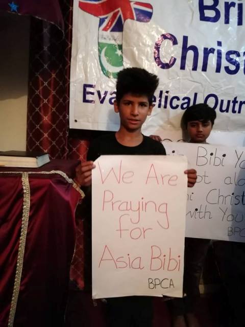 Young boys held signs saying, “Asia Bibi Pakistani Christians are with you,” and “We are praying for Asia Bibi.”