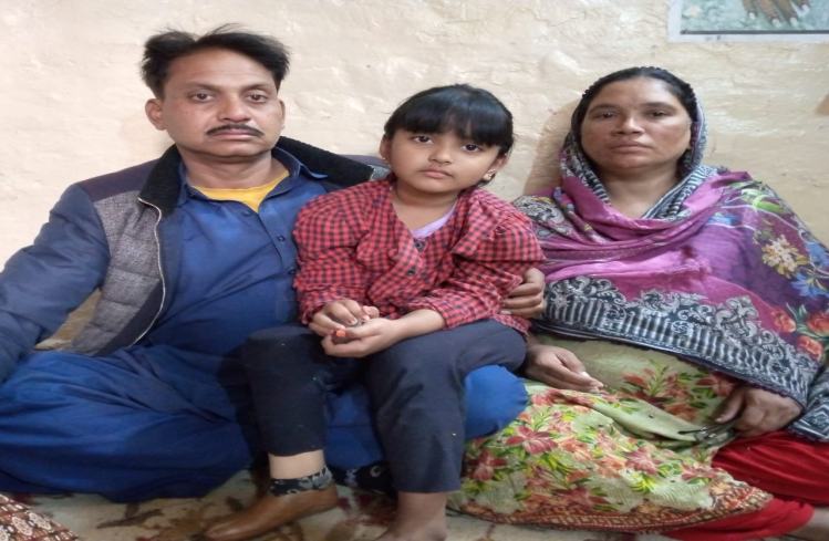 Image of Aleeza Ashiq Masih with her family. She is now 5 years old and her growth rate is more pronounced meaning she requires two limb upgrades each year.