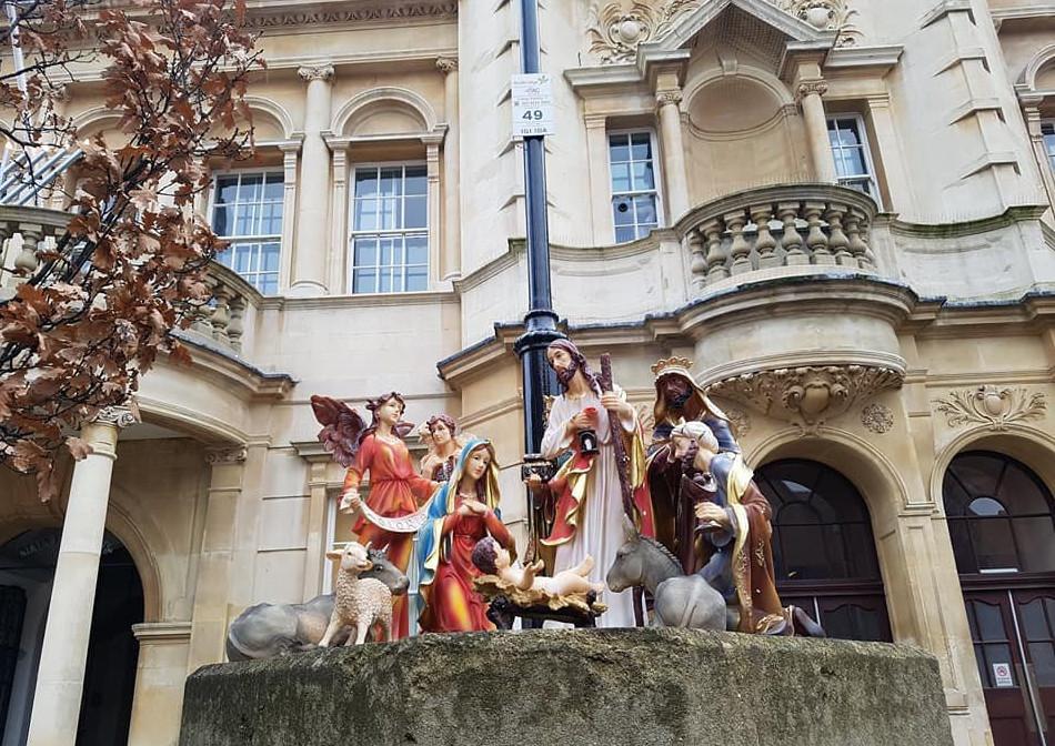 We started a crowd fund and were able to purchase a nativity that we placed in the centre of our town for the first time in 2018. This was after an absence of 21 years. Feedback was good, many local residents climbed the steps of Redbridge Town Hall to view our nativity which was behind the protective grilled-gates to the main entrance. Read more (here).