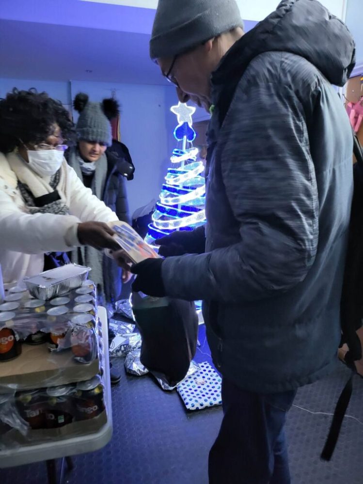 Image: One of our volunteers distributes food, while others locate the correctly labelled gifts with Christmas cards, Christmas crackers and other gifts.