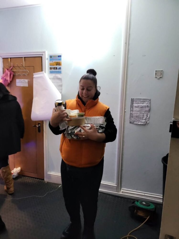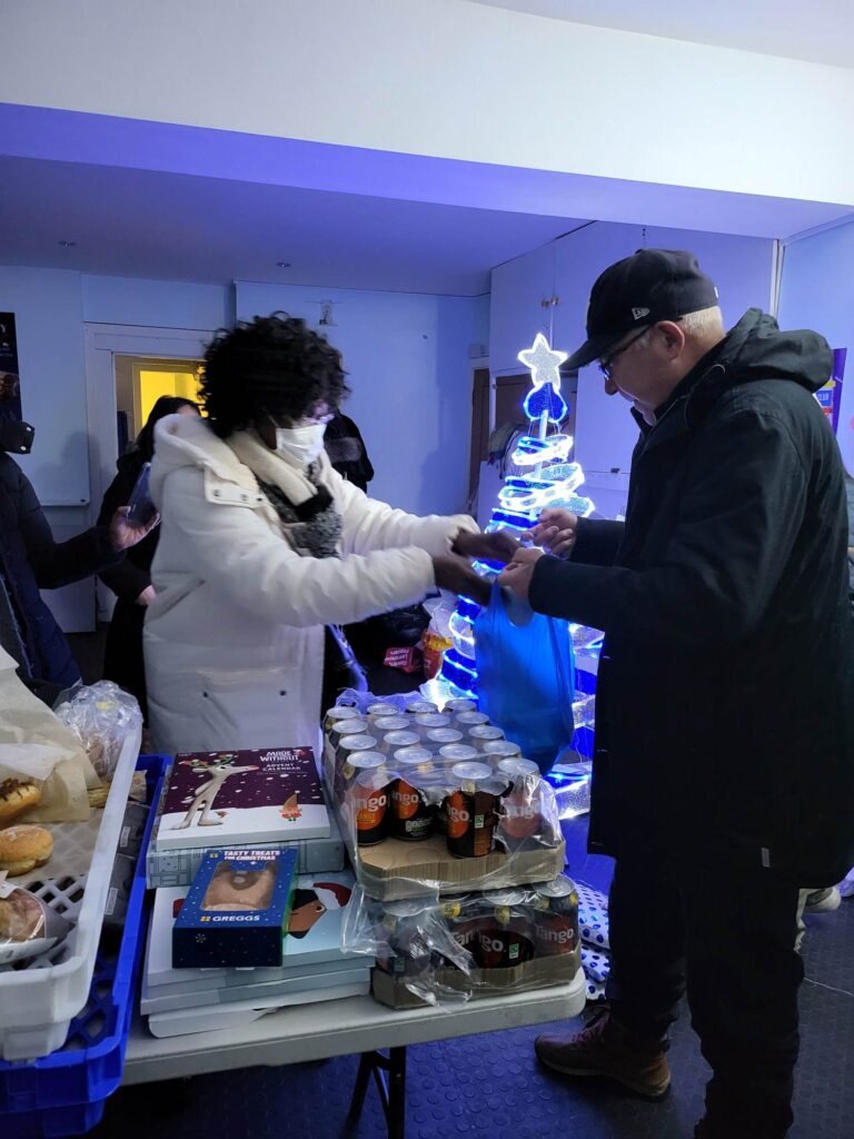 Video: Illustrates the sheer volume of food we distributed with over 50 hot meals and even more cold meals from Greggs and Marks and Spencers. You can see our volunteers busily working away to ensure every visitors was cared for. The woman in the video had not informed us of what gift she wanted but will be receiving size 9 shoes at our regular Meals for the Needy event on Christmas Eve.
